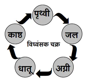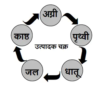काष्ठ(लाकूड) अग्नी उत्पन्न करतो. अग्नी हा पृथ्वी(माती) निर्माण करतो. कारण लाकूड जाळून राख बनते. मातीमध्ये धातू असतात. धातूपासून जल निर्माण होते कारण धातू वितळतो. व द्रव होते. जलापासून काष्ठ(वनस्पती) निर्माण होतात. हे झाले मूलतत्वाचे उत्पादक चक्र.