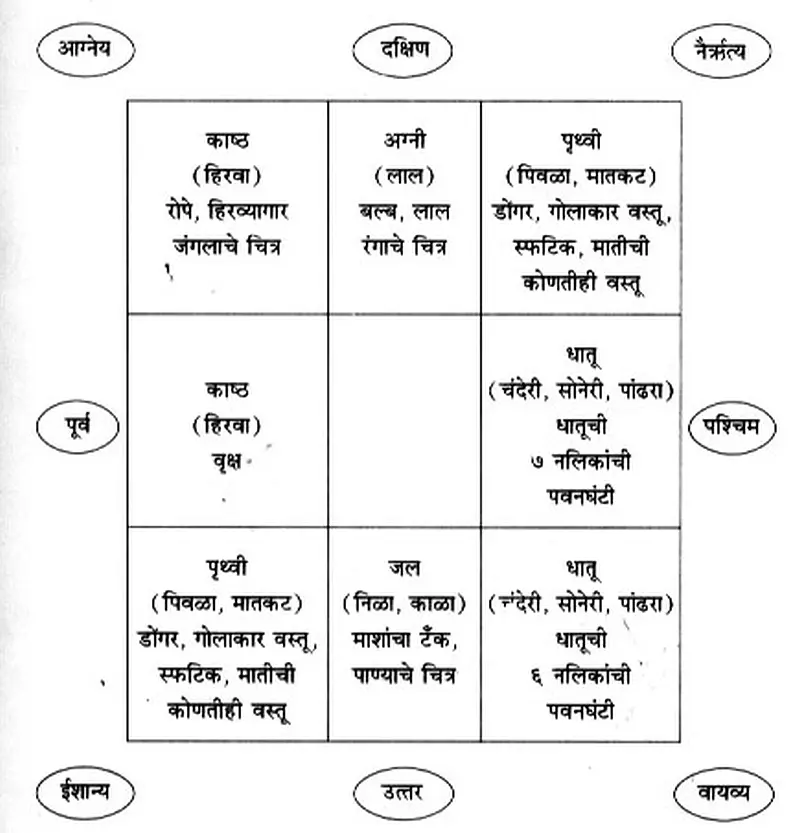 फेंगशुई शास्त्रानुसार कोणत्याही घराचे 9 विभाग कल्पिले आहेत. 1) संपत्ती किंवा भरभराट, 2)किर्ती, 3)विवाह संबंध, 4)वडीलधार्‍यांचे आशिर्वाद, 5)आरोग्य, 6)सर्जनशीलता व अपत्य, 7)ज्ञान आणि शिक्षण, 8)करीयर किंवा कारकिर्द व 9)मैत्री संबंध.