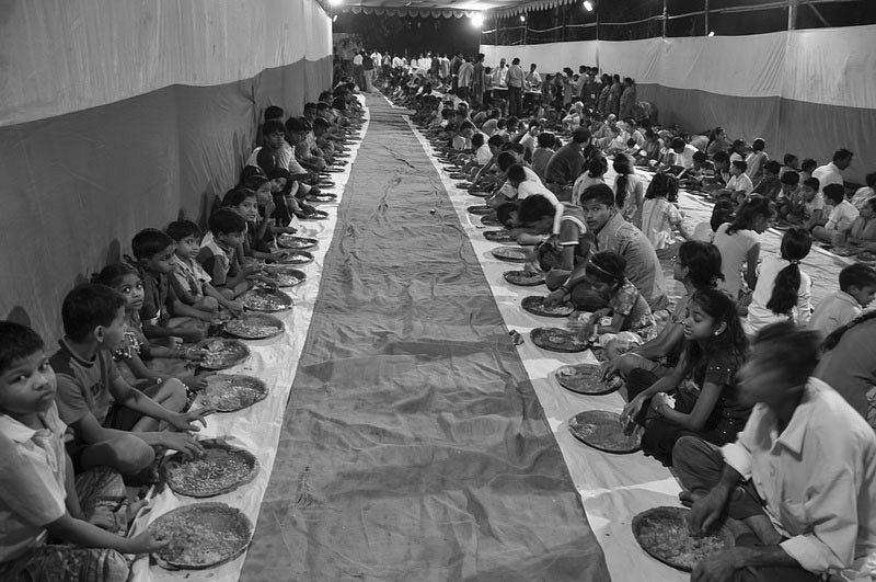 मंदिर छोटे असो वा मोठे, देवाची मूर्ती झाडात कोरून ठेवलेली असो अथवा छप्परवजा रस्त्याकडेला असो महाप्रसादाच्या आयोजनासाठी फारसा फरक पडत नाही. राबणारे तरूण कार्यकर्ते, सेवानिवृत्तांचा ‘धार्मिक’ आधार, प्रतिष्ठितांचा ‘आर्थिक’ आशिर्वाद व पोटभरू धार्मिक अनुयायांची रांग एवढ्या गोष्टी जमून आल्या की, ‘महाप्रसाद’ सफल झालाच म्हणून समजा. रस्त्याच्या ह्या टोकापासून त्या टोकापर्यंत आकर्षक सजावटींचा शामियाना अथवा मांडव उभारायचा. ओळीने टेबल-खुर्च्या मांडायला, जेवणासाठी मोठ मोठी पातेली गॅस शेगडीवर ठेवायची. देवाच्या मुर्तीला अथवा फोटोला भरगच्च फुलांचा हार, मोठ्या समई लावायच्या, स्टिरिओ बॉक्सवर धार्मिक गाणी लावायची, पाण्यासाठी महापालिकेचा टँकर मागवायचा, तत्पूर्वी एक दिवस अगोदर स्थानिक नगरसेवकांना सांगून संबंधित परिसराची साफसफाई करून घ्यायची. ‘पावडर’ मारून घ्यायची एवढी सारी तयारी करायची आणि प्रतिष्ठित राजकीय नेत्याच्या शुभहस्ते(?) पंगत सुरू करायची. त्यावेळी पेपरमध्ये उठून दिसेल असे ‘दानशूर’ व्यक्तींबरोबर फोटोसेशन करायचे. पंगतीमागून पंगती उठू लागतात आणि सायंकाळच्या वेळेस आवराआवर सुरू करायची असा हा दिनक्रम असतो.