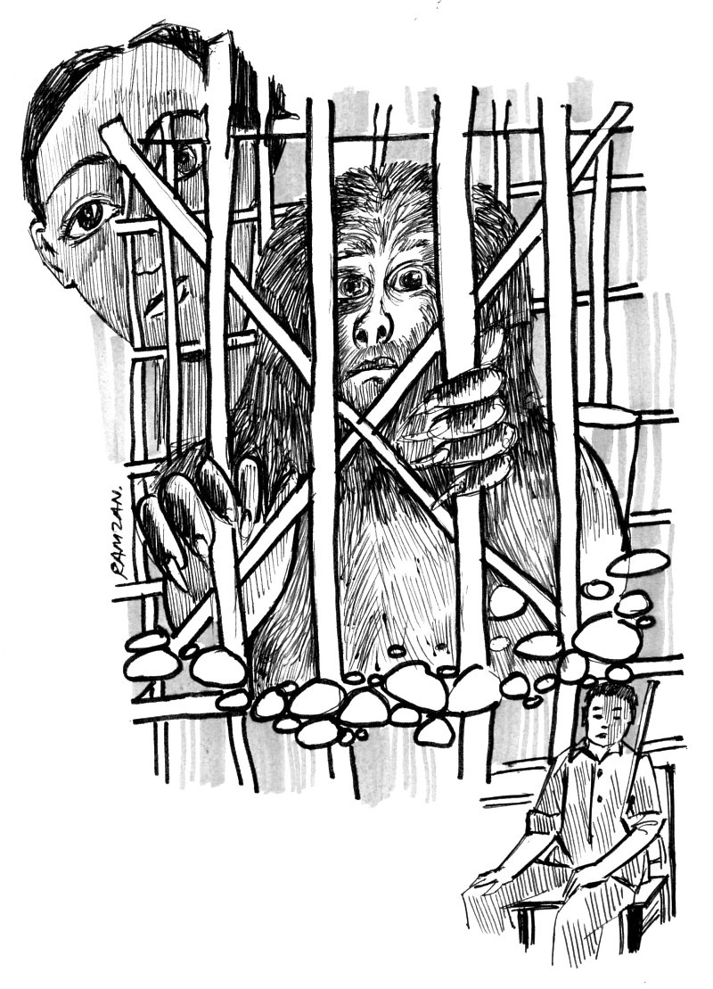 आम्ही तिथे असतानाच एका सशस्त्र वॉचमनने एका प्लॅस्टिकच्या बादलीत कच्चं कुठल्याशा जनावराचं मांस आणून त्या आदिमानवाला खायला दिलं. आदिमावनाच्या जबड्याचा जोर प्रचंड होता, हे मी डोळ्यांसमोरच पाहिलं.